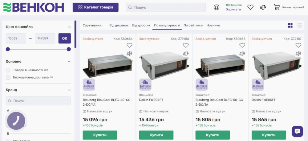 Інтернет-магазин техніки Vencon.ua пропонує більше 300 моделей фанкойлів від шести виробників з різними технічними параметрами, що дозволяє знайти рішення для житлових, комерційних і великих приміщень. Каталог містить моделі з різними показниками сумісності площі обігріву та охолодження, включаючи бюджетні варіанти та потужні рішення для масштабних просторів.